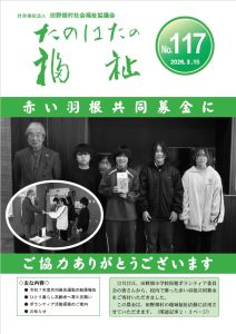 たのはたの福祉№117 2026/03/15 広報紙「たのはたの福祉№117」を掲載しました。 ○表紙(1ページ) ○令和7年度共同募金運動の結果報告(2・3ページ) ○ひとり暮らし高齢者へ寒中見舞い(4ページ)、ボランティア活動保険のご案内(5ページ) ○お知らせ(6・7ページ) ○社協カレンダー(8ページ)